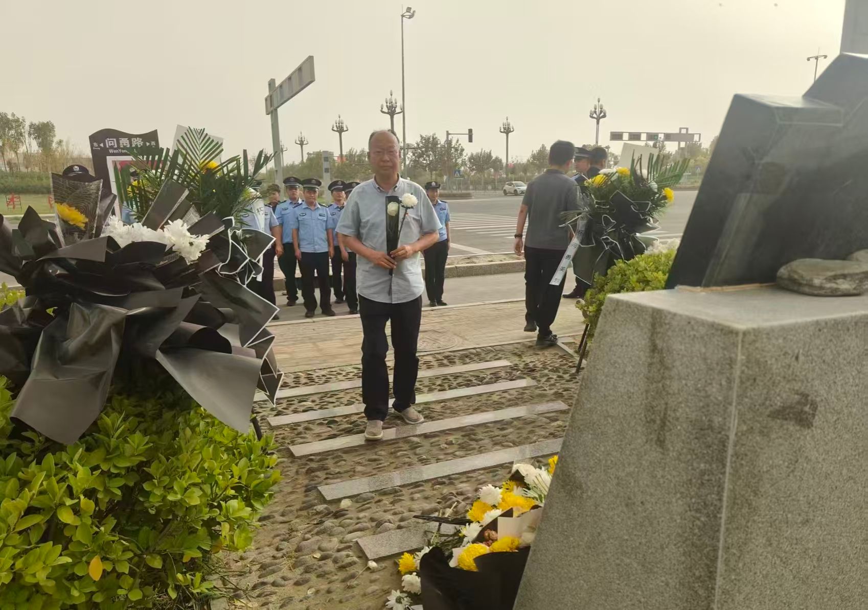 活动伊始,全体人员在“问勇路”题记碑前整齐列队,庄严肃立。保卫处与属地公安部门代表共同向烈士敬献花篮,全体同志向英烈三鞠躬,默哀致敬,表达对革命先烈的深切缅怀。